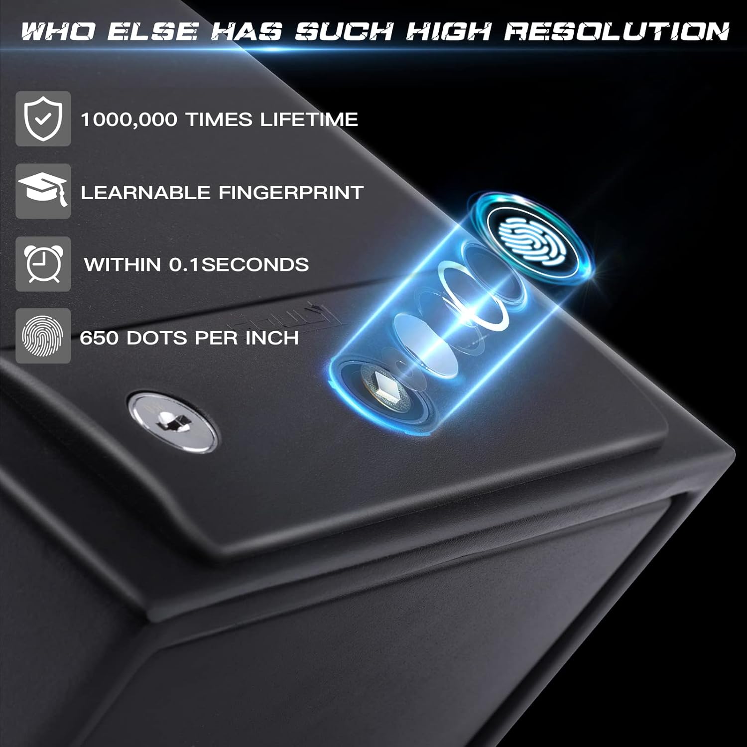 The SOULYI Biometric Fingerprint Gun Safe provides secure storage for pistols, ammunition, money, and other valuables. It features quick biometric access and a robust alloy steel construction.