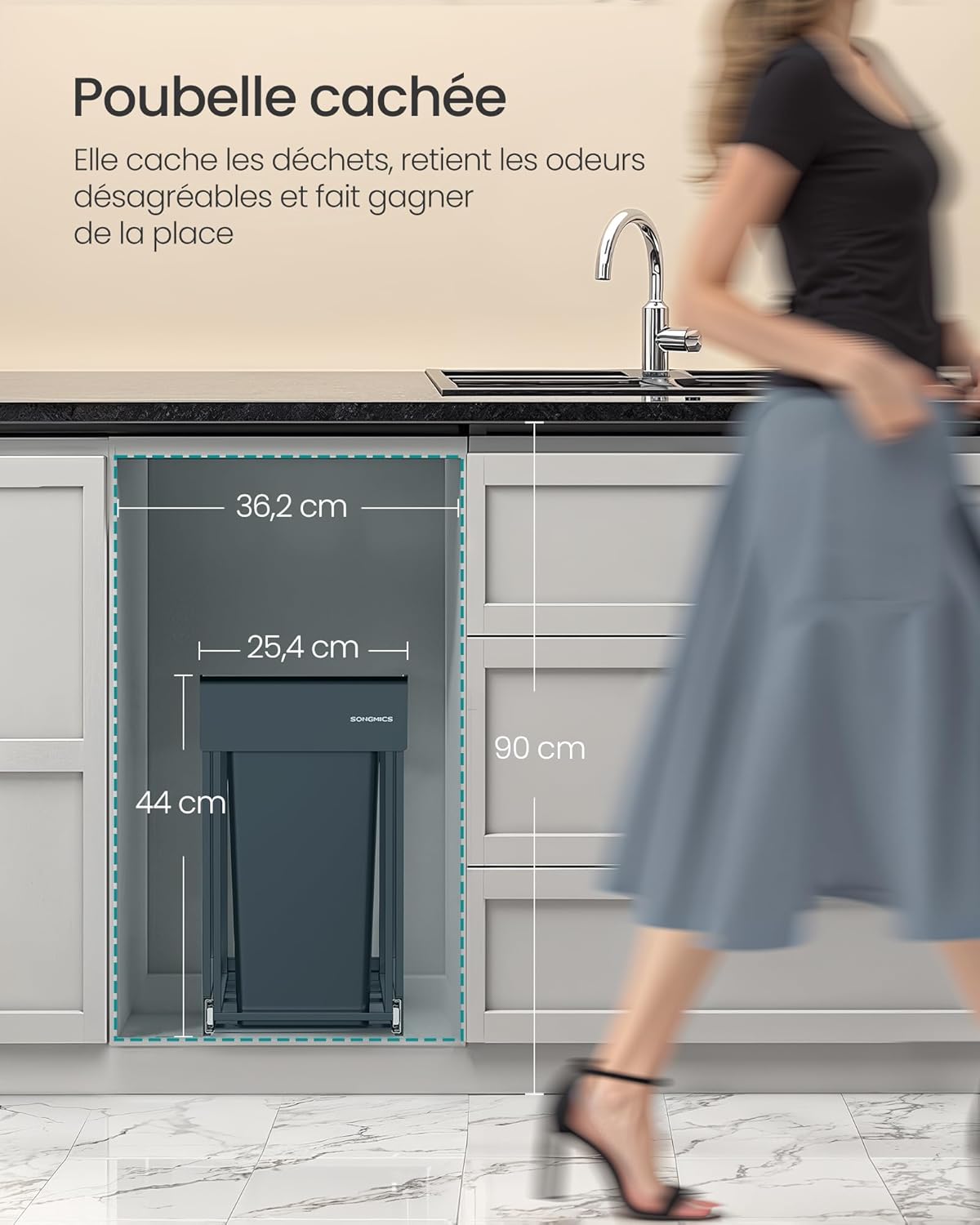 Image 1.1: The SONGMICS pull-out recycling bin discreetly installed under a kitchen counter, illustrating its space-saving design and general dimensions.