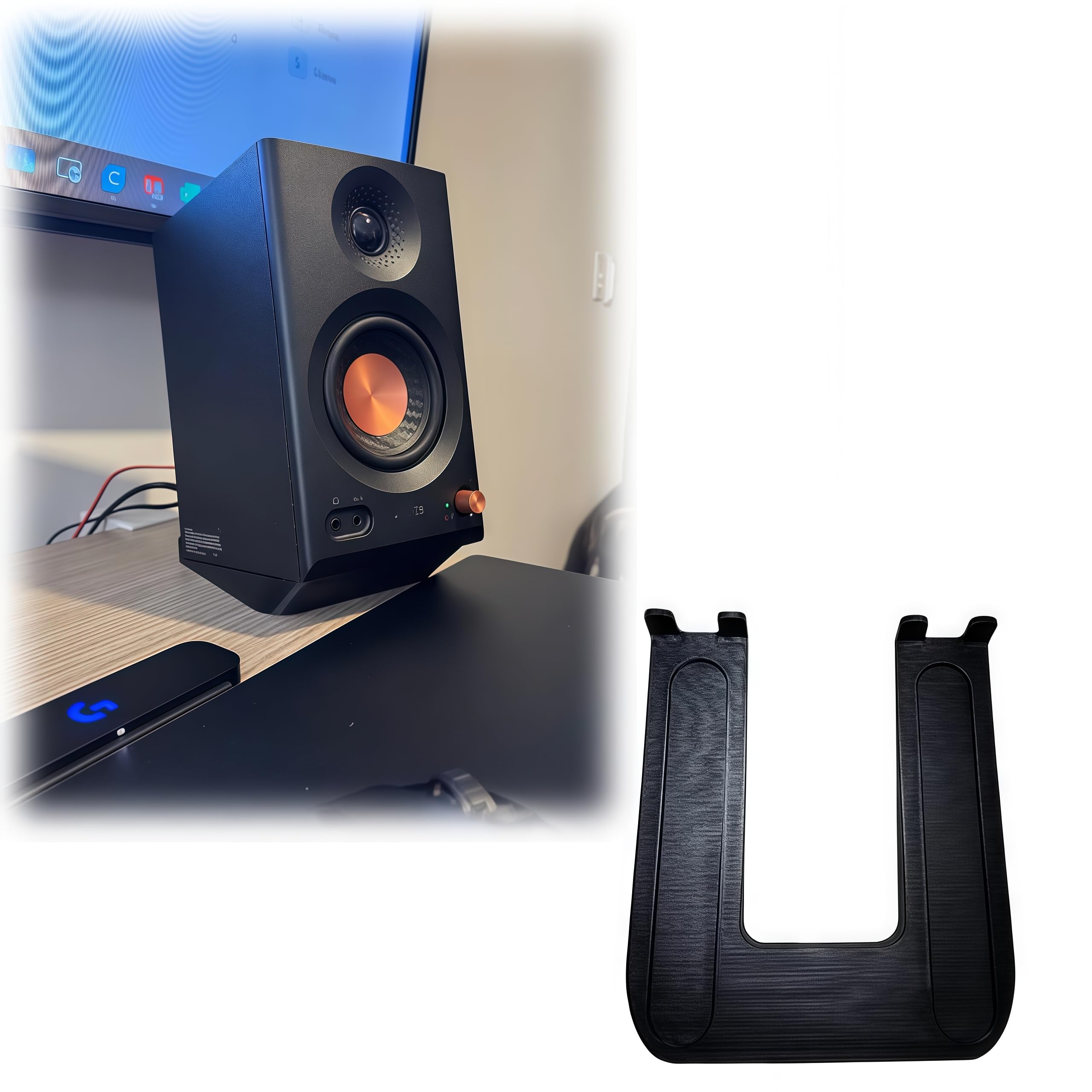 Once installed, the speaker bracket requires no further operation. Its purpose is to provide a stable, angled platform for your Edifier MR3 speakers. The 5-degree upward tilt helps to elevate the soundstage, directing audio more effectively towards your ears when seated at a desk, thereby improving clarity and stereo imaging.
